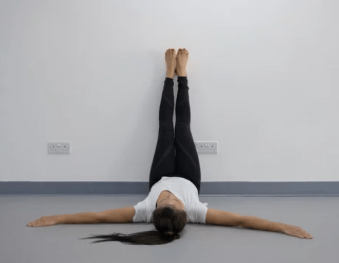 仰向けになり、足裏と足指を壁にピタッと付け、足全体のラインを整える